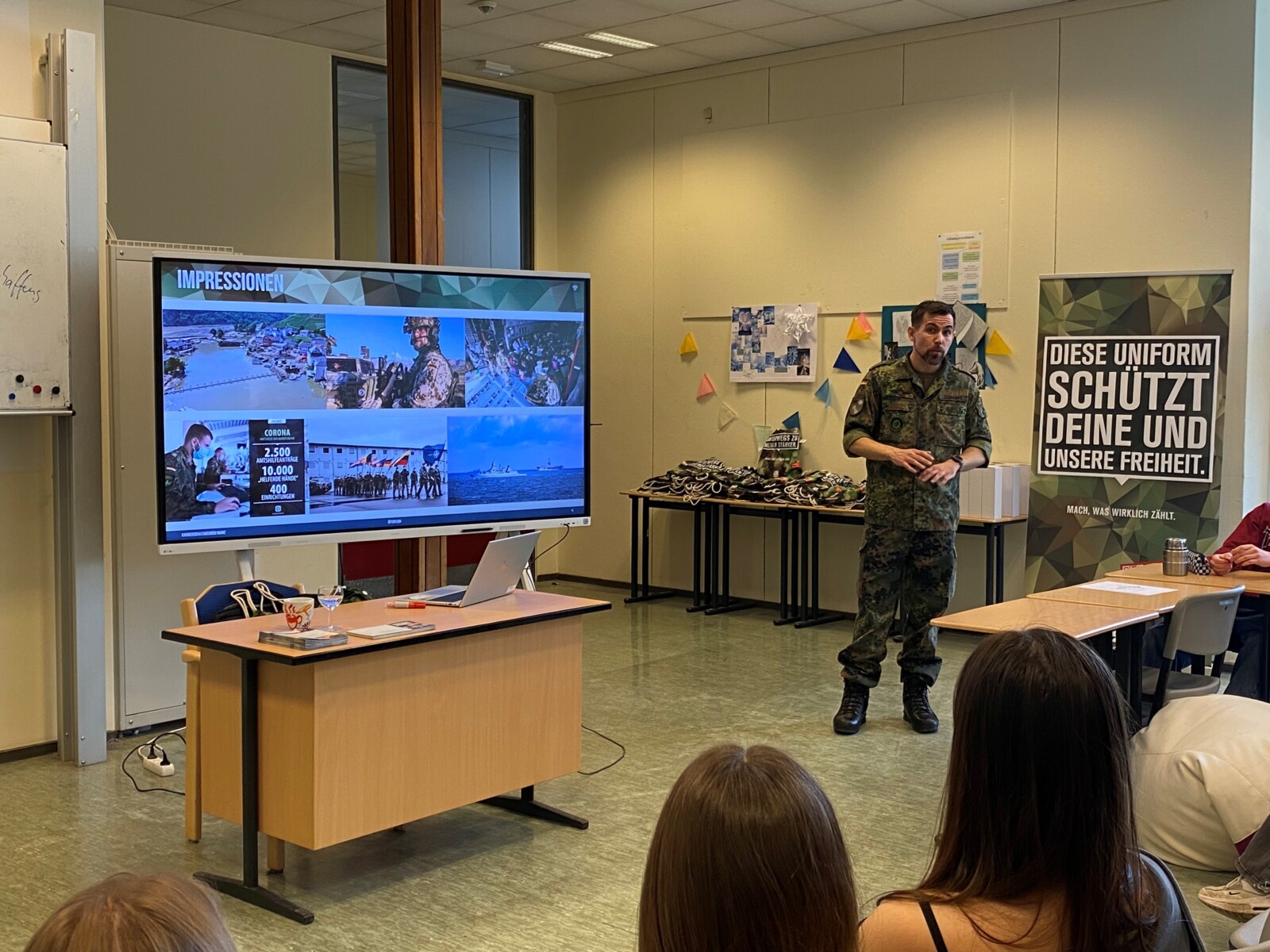 Im Rahmen eines zweistündigen Workshops besuchten am 17.03.2026 zwei Vertreter der Bundeswehr die 12. Jahrgangsstufe unserer Schule. Im Fokus standen dabei sowohl die Vermittlung eines fundierten Demokratieverständnisses als auch Einblicke in verschiedene Karriere- und Ausbildungswege innerhalb der militärischen Laufbahn.