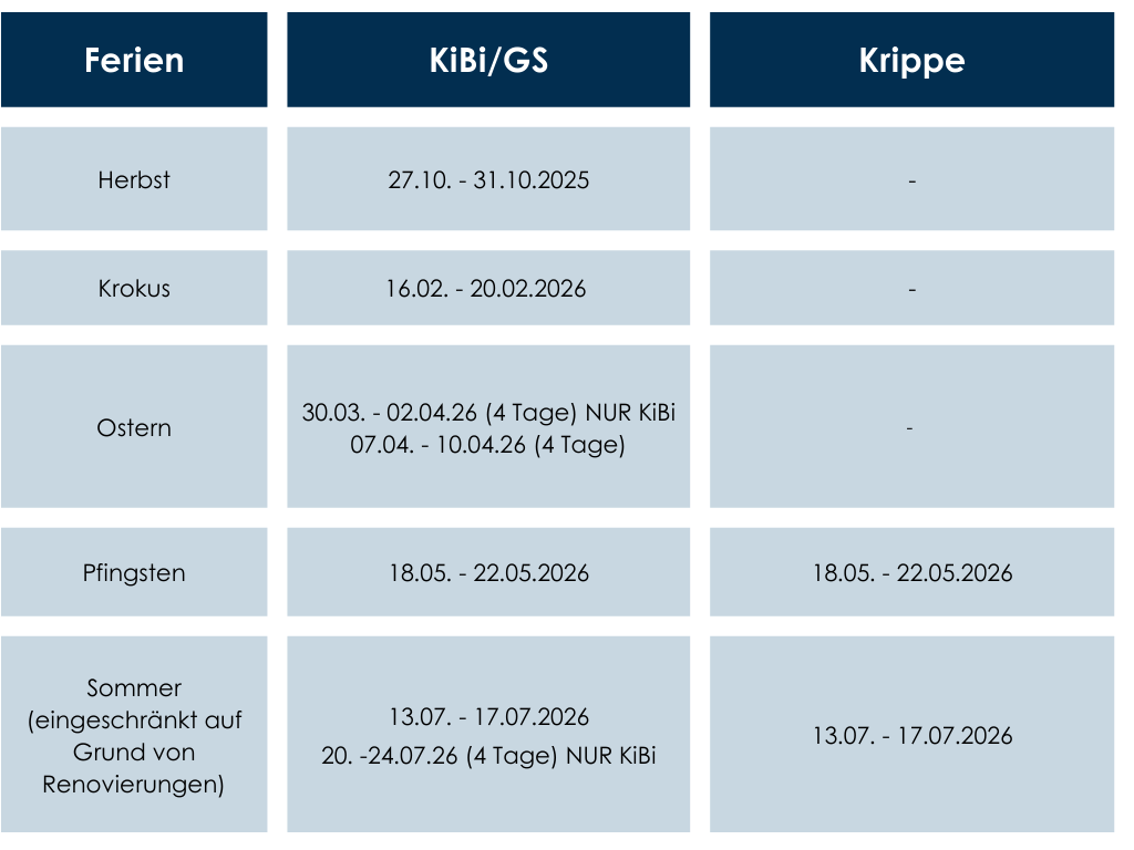 Die Ferienbetreuung richtet sich an Kinder im Alter von 2 bis 6 Jahren. Dieses Angebot findet in den Räumlichkeiten unseres Kindergartens statt. Grundschulkinder von der 1. bis zur 4. Klasse können sich auf ein spannendes Programm in der Grundschule freuen. Wir starten um 8.00 h mit unserer Betreuung, der Tag endet um 16.00 Uhr.